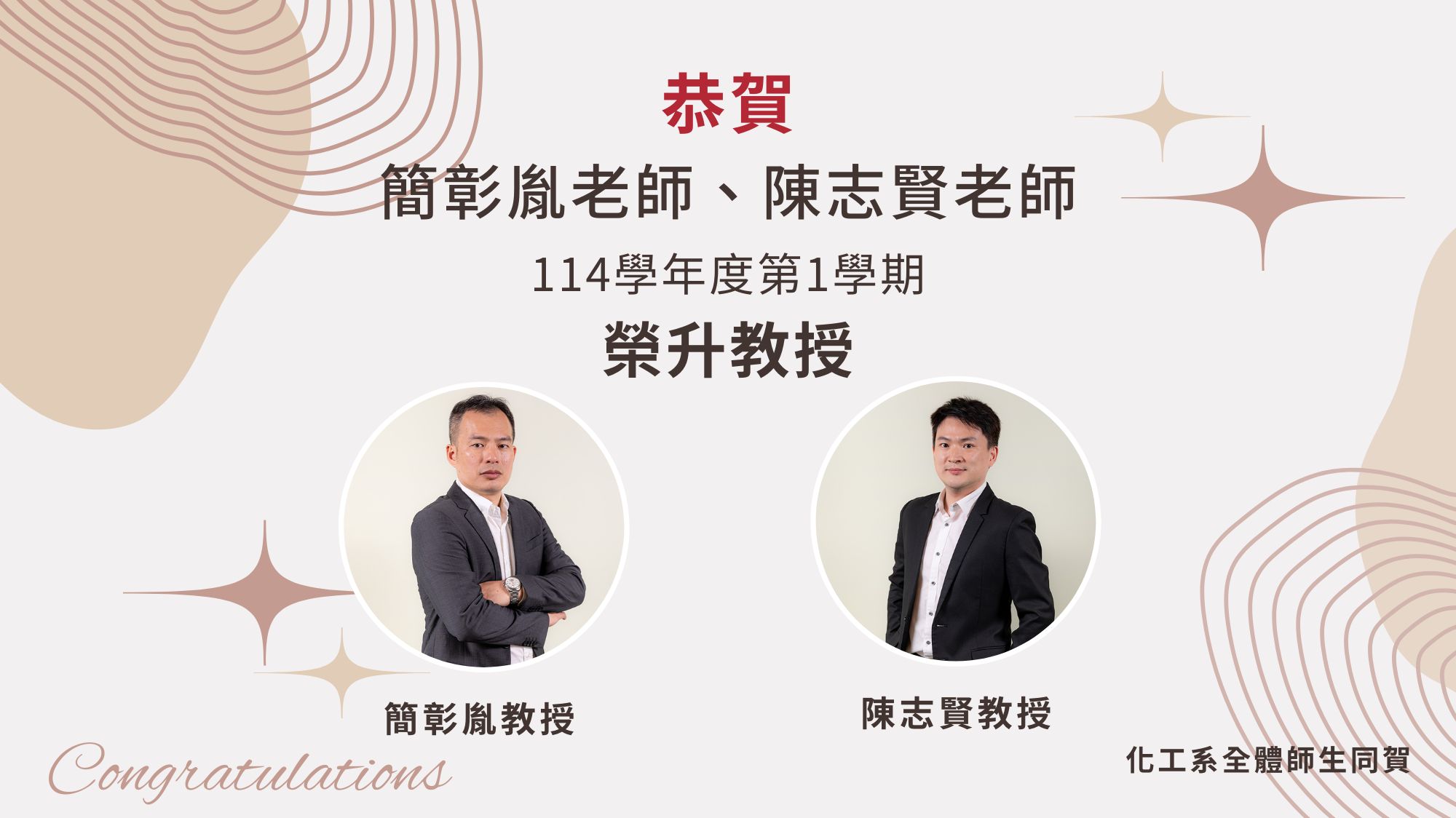 本系簡彰胤老師與陳志賢老師自114學年度第1學期榮升教授。